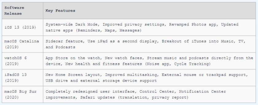 Now that we’ve discussed the top software releases from Apple in the last five years, let’s compare them in a detailed table: